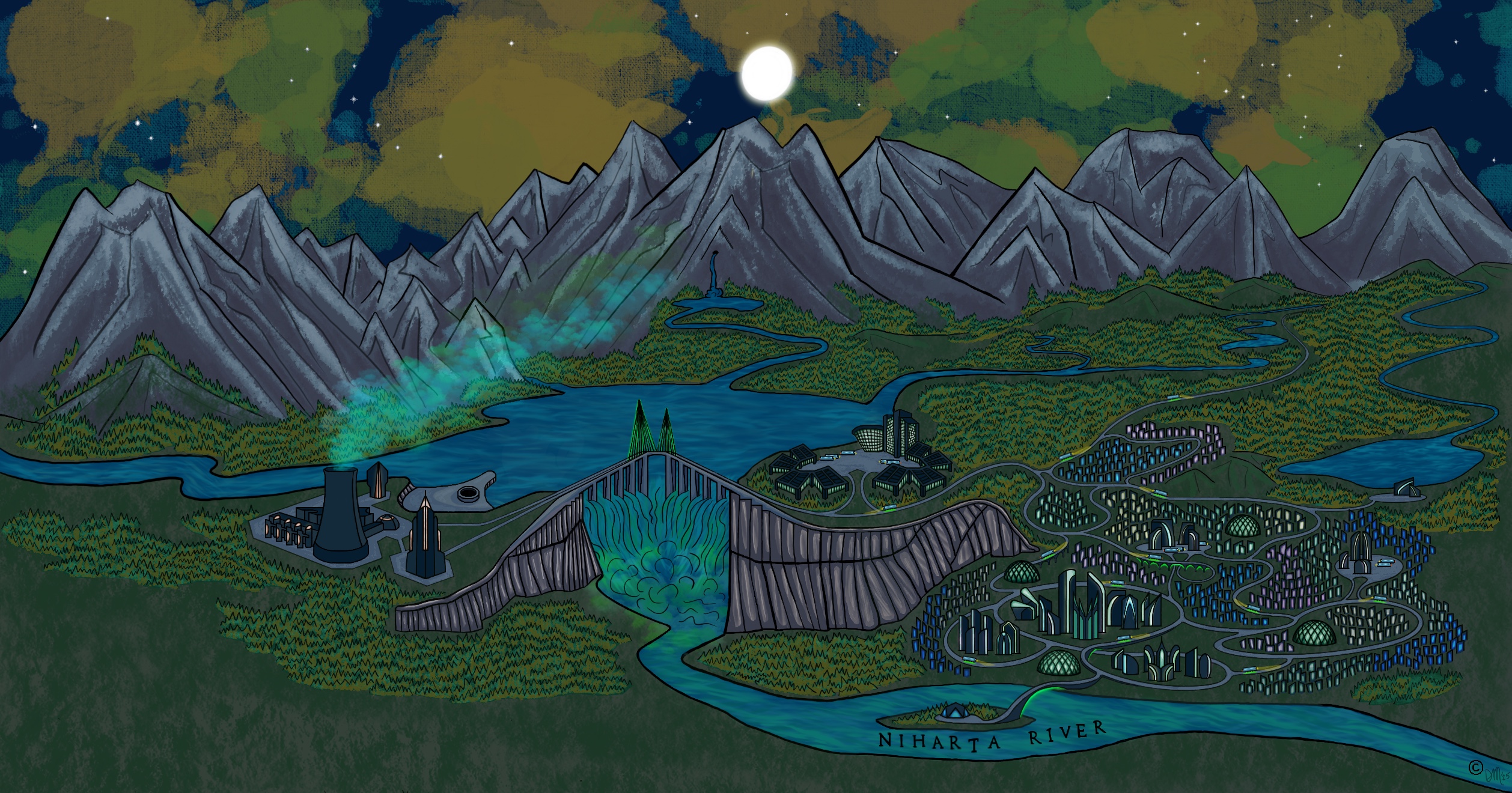 The Niahata River, fed by basins and tributaries from the central region of North America that were highly saturated by Chaos Energy radiation, has a reservoir that became a rich store site for Chaos Energy. International peacekeeping force, The Guardians, set up an outpost in Vinton from which to monitor the effects and study the Chaos Energy. To support the sudden investment in the small sleepy town, The Guardians invested heavily in the infrastructure of Vinton, building neighbourhoods, shopping centres, and bringing new technology initiatives into the city.